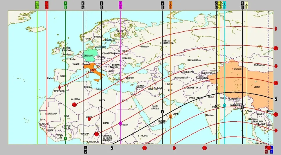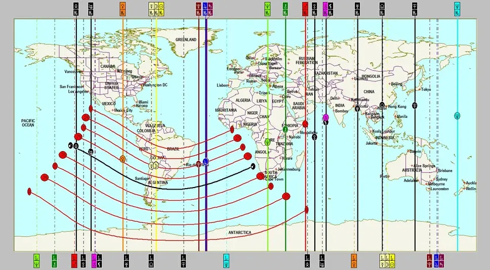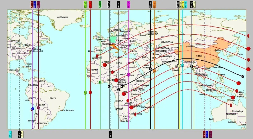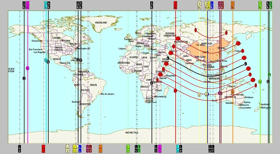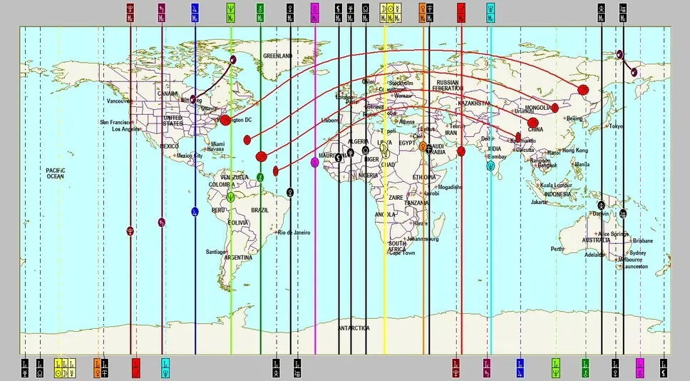 Wieder ist China betroffen, aber die Ausläufer zeigen deutlich bis Südeuropa, besonders Italien liegt noch innerhalb des roten Wirkungsspektrums. Besonders die Ostküste der Vereinigten Staaten ist von der signifikanten Konstellation Saturn-Pluto, diesmal mit dem expansiven Jupiter negativ verstärkt betroffen.